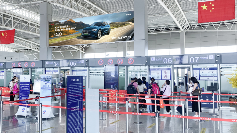 媒体概述:①出发安检 正迎面 ②100%覆盖出发旅客及送客人群 ③周边环境宽阔、明亮,无任何遮挡物。 ④ 可视距离长,画面极具视觉冲击力。